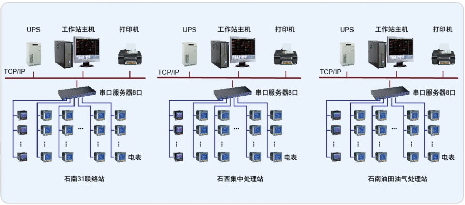 本系统针对以上需要解决的问题,对石南31联络站、石西集中处理站和石南油田油气处理站三个站进行能耗管理系统改造,其中石南31联络站配置仪表78块,石西集中处理站配置仪表35块,石南油田油气处理站配置仪表59块,进线回路采用ACR320ELH多功能显示仪表,出线回路采用PZ72-E4/KC,每个站为单独一套系统。系统采用分层分布式结构,监测数据采集完成后上传传至各自站内监控值班监控室。