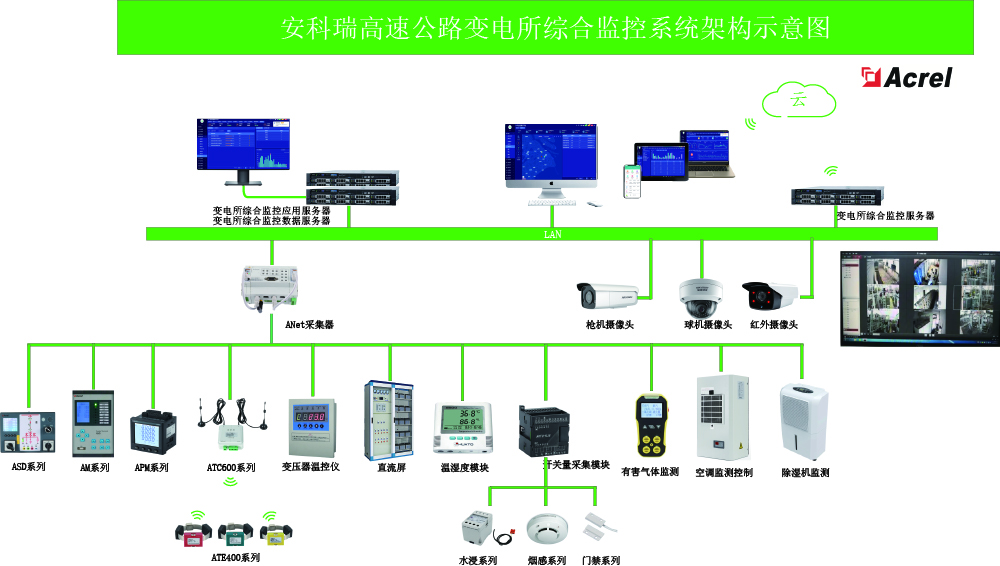 Acrel-2000E配电室综合监控系统,可实现开关柜运行监控、高压开关柜带电显示、母线及电缆测温监测、环境温湿度监测、有害气体监测、安防监控,可对灯光、风机、除湿机、空调控制等设备进行联动控制。实现动力环境各数据的检测与设备控制,优化动力环境,避免运行环境的失控导致配电设备运行故障,保证维护人员安全,延长设备使用寿命,实现配电动力环境的分布式远程管理。