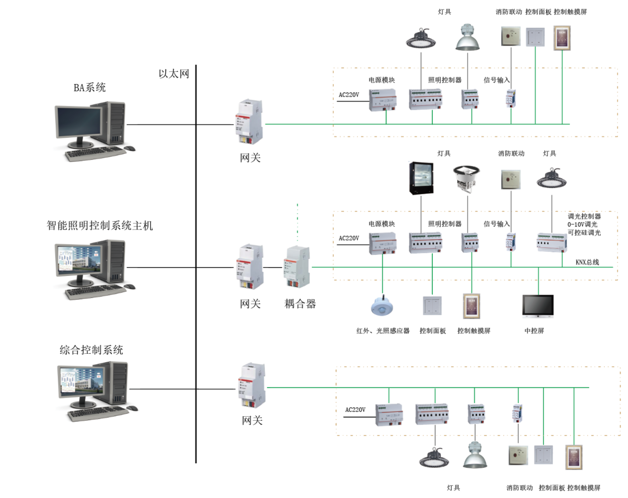 系统在配电箱内的模块主要有总线电源、开关驱动器、IP网关、耦合器、干接点输入模块等。这些模块使用35mm标准导轨安装。