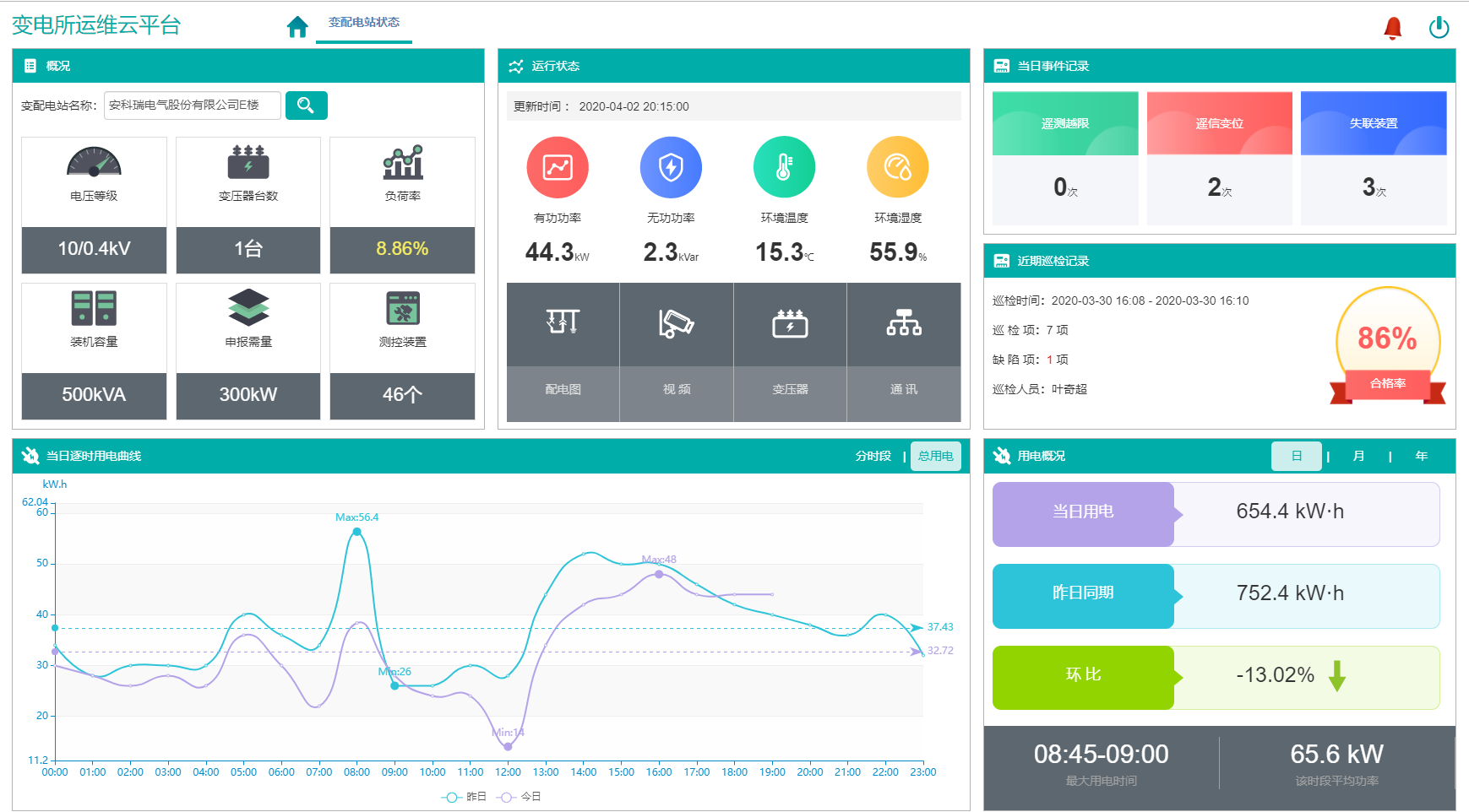 变电站状态包括概况、运行状态、当日事件记录、当日逐时用电曲线、用电概况。