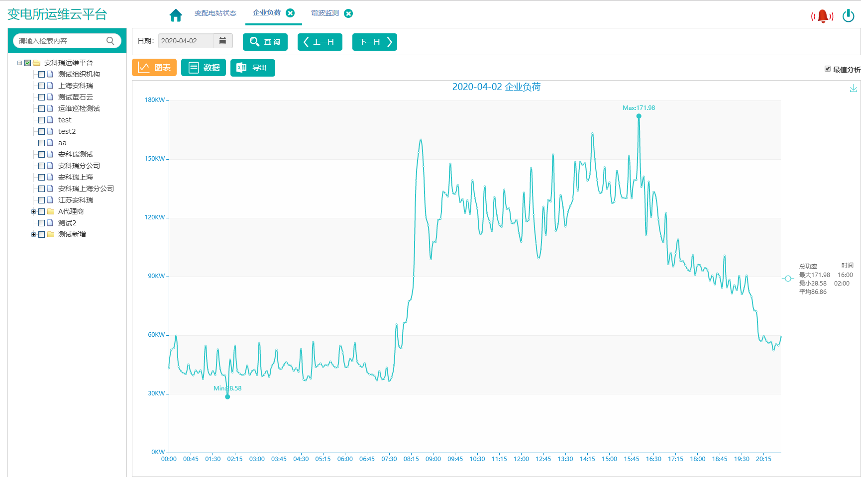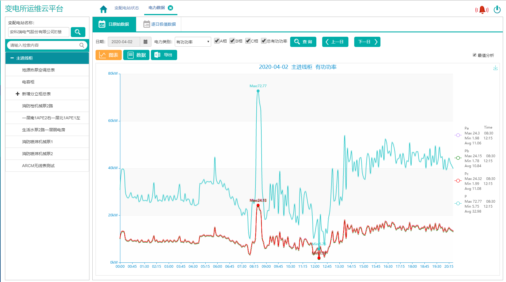 电力数据显示选定变电所选定回路的电力数据和曲线,包括电流、相电压、线电压、频率、功率因数、有功功率、无功功率、视在功率、电压、电流不平衡度等参数,曲线显示统计期内大、小、平均值,并支持导出图表;方便用户通过表格查询数据