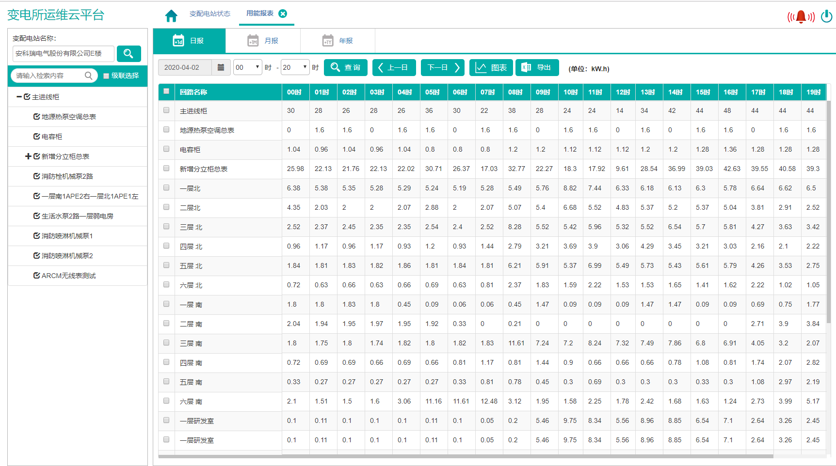 用能报表显示各回路的用能数据,包括日报、月报、年报,日报显示分时用能,月报显示分日用能,年报显示分月用能,报表可以导出。