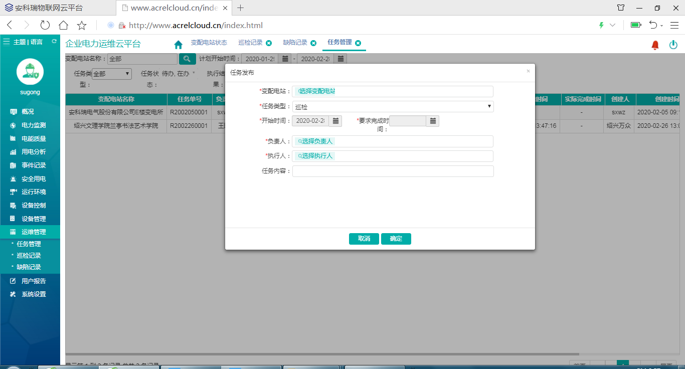 运维管理包括任务管理、巡检记录、缺陷记录三部分,其中任务管理可以完成任务的创建、发布、任务完成情况查询;巡检记录是巡检任务的执行情况和执行明细,缺陷记录是消缺任务创建、发布、完成状态情况查询。