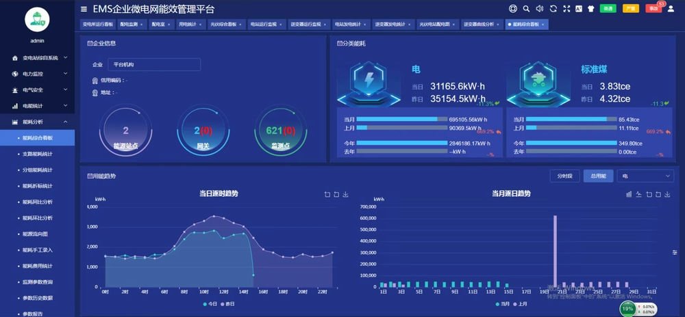 采用EMS能源管理解决方案,采集电表和逆变器的电压电流功率电能等数据,形成电能一次系统图,实现用电的智能化管理。在每一个配电间还加装有烟感、水浸、门磁等来监测配电间整体环境状态保证用电的安全性。在配电环节加装有我们公司的电能质量和滤波装置更好的保证了用电的可靠性。