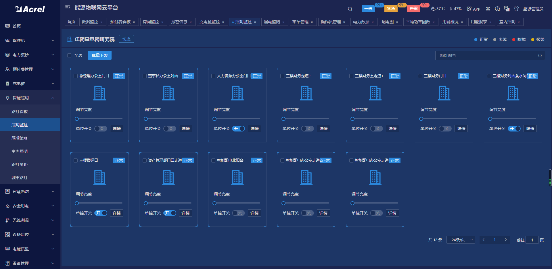 智能照明通过物联网技术对安装在城市各区域的室内照明、城市路灯等照明回路的用电状态进行不间断地数据监测,也可以实现定时开关策略配置及后台远程管理和移动管理等,降低路灯设施的维护难度和成本,提升管理水平,并达到一定节能减排的效果。