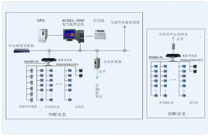 系统采用Acrel-2000型电力监控系统,监控主机位于1#配电室内电力监控值班室,2#配电房距离值班室较远,通过通讯管理机将采集的数据经处理后经光纤收发器和光缆上传至位于1#配电室内电力监控值班室;所有配电回路均配备安科瑞电力仪表ACR系。该项目实现了13号地块电力系统的智能管理。所有监控设备均通过屏蔽双绞线至各自配电室内的通讯管理机,再通过光电转换器经过光纤将数据传输至1#配电室内电力监控值班室,从而实现远程监控。