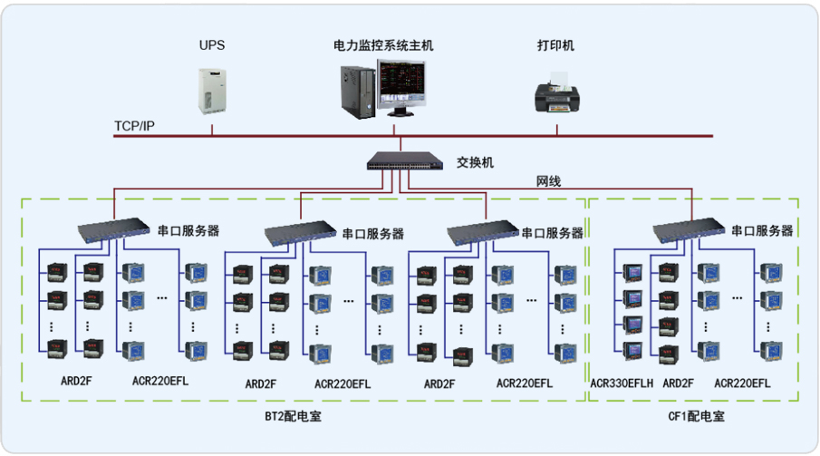 整个系统采用分层分布式结构,主控层监控主机位于BT2值班室内,各变电所间隔层配电柜内安装有本公司ACR220EFL多功能仪表、ACR220EFLH多功能仪表、ARD2F电动机保护器,共计500多回路。BT2/CF1配电室内各仪表通过RS485总线连接至通讯管理层的串口服务器NPORT5610-16,再通过串口服务器将数据上传至到主控层电力监控系统。