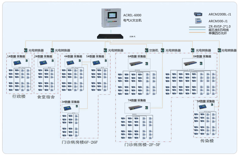 系统采用Acrel-6000电气火灾监控系统,整个系统采用网络分布式结构,监控主机位于消控中心值班室门诊一层,其余9个数据采集箱分布在行政楼、门诊病房楼、食堂宿舍楼、感染楼,现场采用安科瑞ACRM系列漏电火灾仪表。所有监控设备均通过屏蔽双绞线至各自数据采集箱的通讯管理机,再通过光电转换器经过光纤将数据传输至消控中心值班室门诊一层,从而实现远程监控。