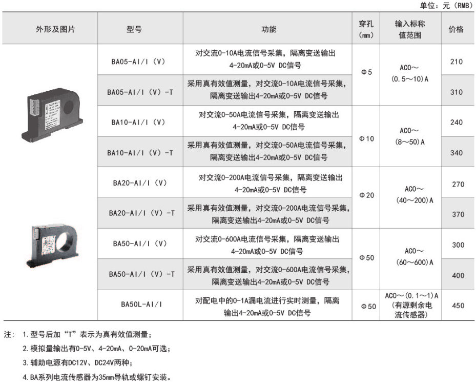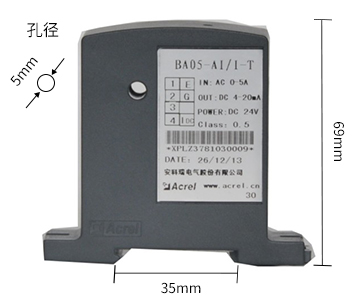 产品简介:BA系列产品应用电磁感应原理,对电网中的交流电流进行实时测量,将其隔离变换为标准的直流信号输出。