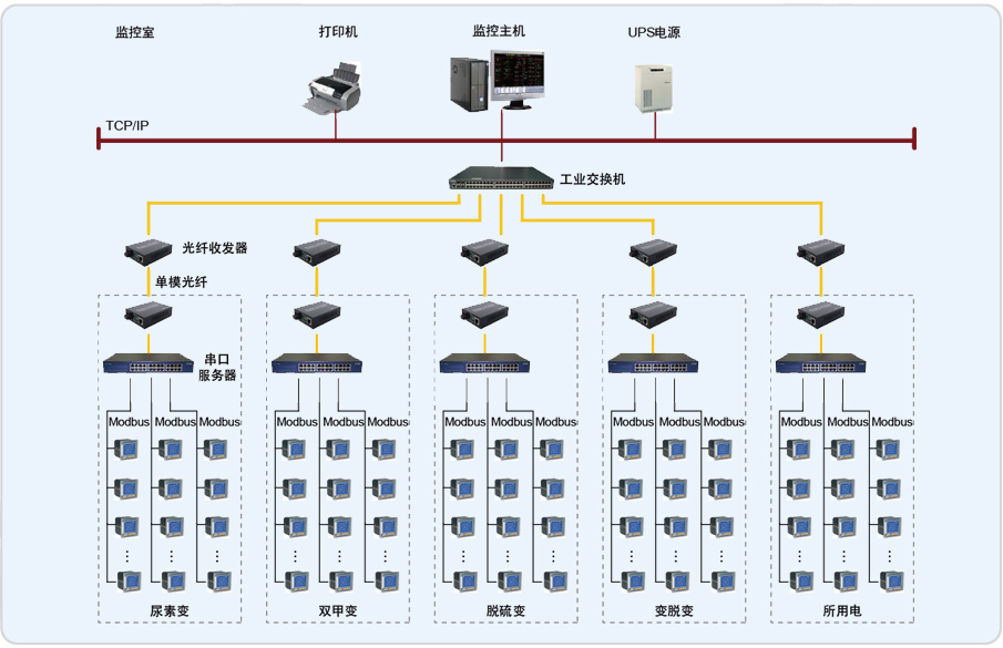 本项目针对现场3个低压配电室(A、B、C)内安装的100只左右电力仪表。监控室在A配电室内,B配电室距离A配电室200米左右,仪表为20只左右。另一个C配电室距离A配电室600米左右,仪表为40只左右。